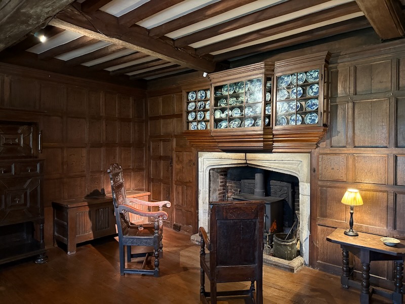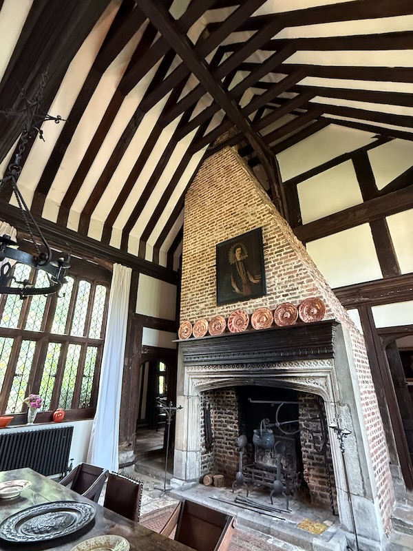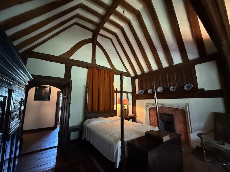 This is the Great Hall, which is mostly how it would have looked in the original house except for a few points. There were no glass windows and no fireplace. Instead, there would have been a fire pit in the center of the room and the smoke would go up into the ceiling and out from smoke holes on either end of the room. The floor would have been covered with straw and windows covered by cloth or animal skins. In the 16th century renovation, the fireplace was added, which allowed the smoke to not accumulate in the rafters. An upper floor was installed (lowering the ceiling) to allow new bedrooms put there. With the fire pit removed from the center of the room, the new flooring was added. The fireplace here has an interesting story. It is a 15th-century fireplace that was found in a medieval house in a nearby town behind a wall when the house was being demolished. In 1920, the restoration removed the upper floor to put it back to the original height but kept the floor and fireplace.