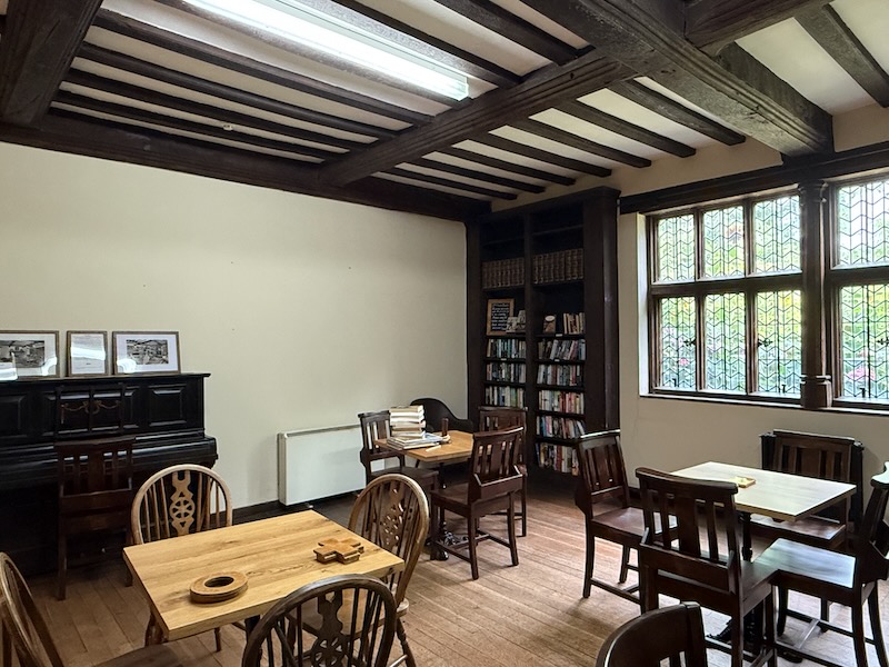 The library was added in 1925 during the restoration. The nice thing here is that the owners attempted to keep the design similar to the original house by adding the timber beams on the ceiling.