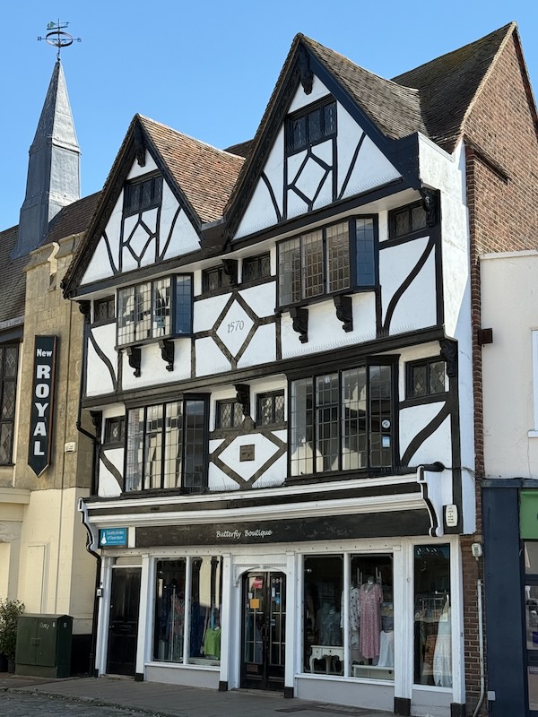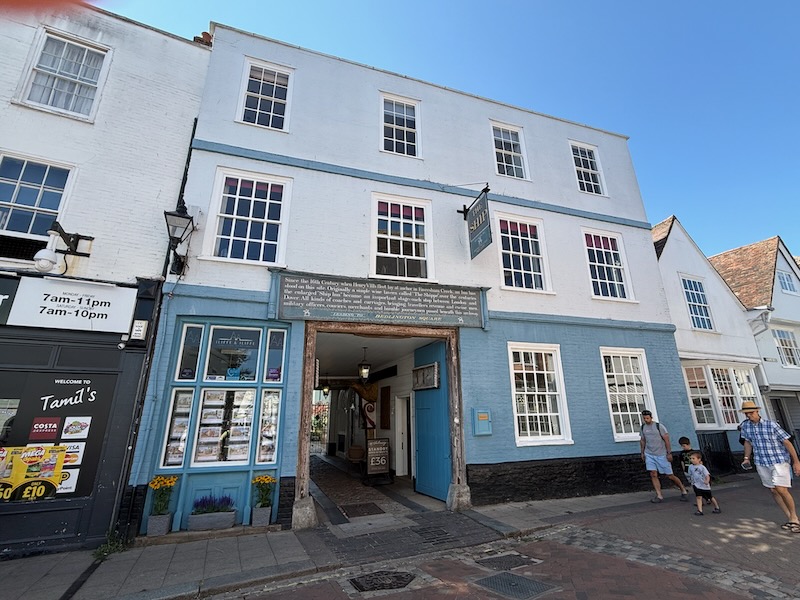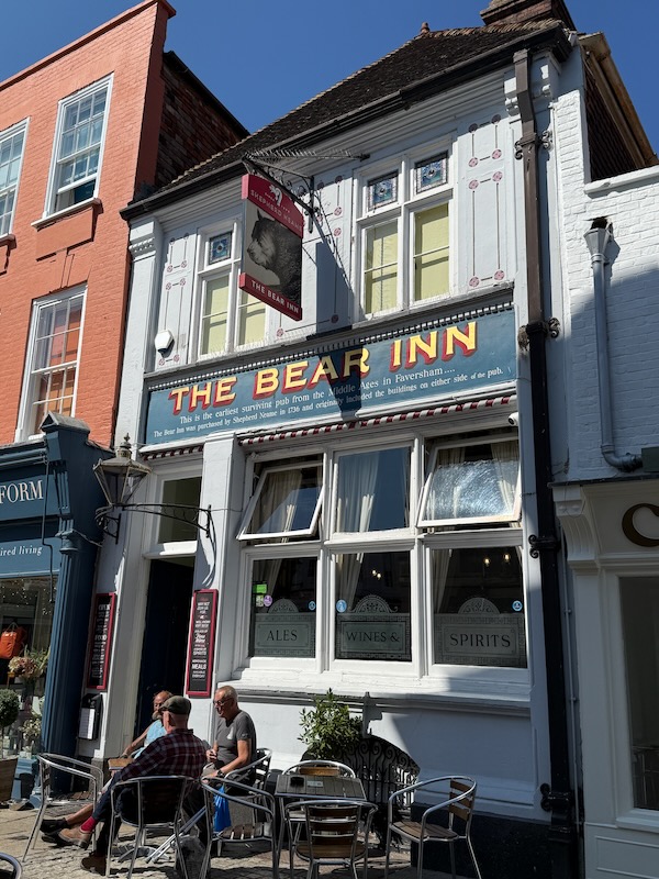 Around the square are other interesting buildings: this first one from 1570, the white-and-blue Ship Inn, dating from the 16th century when King Henry VIII's fleet was anchored in nearby Faversham Creek. The Bear Inn says it is the earliest surviving pub from the Middle Ages in Faversham.