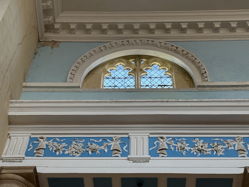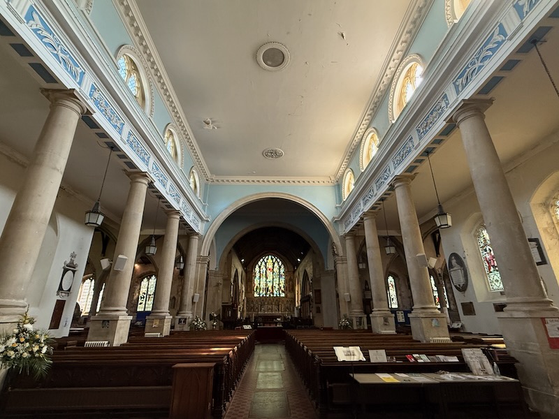 The nave is definitely different than most of the English churches we saw. It is rectangular with side aisles separated by columns, but the real differences are when you look up ... a flat, white ceiling and blue upper-walls with white molding decoration.