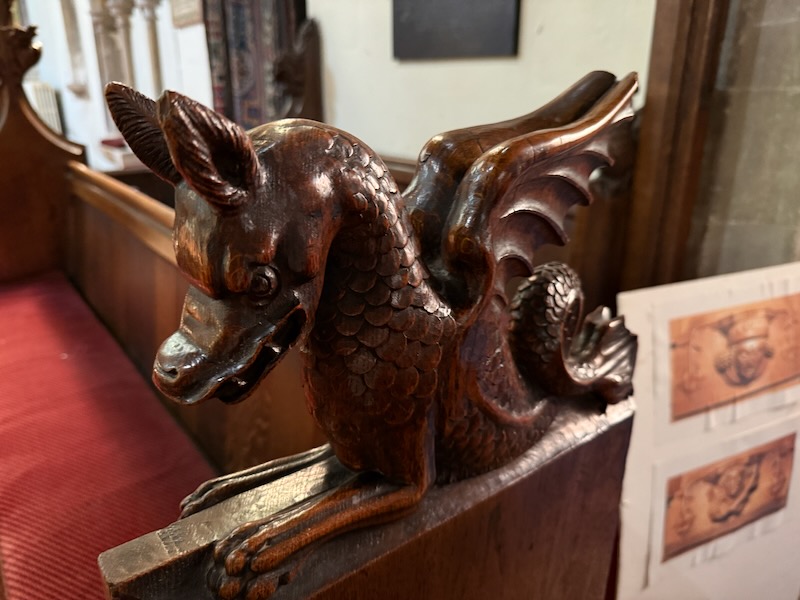 The choir stalls have carvings on the back of the stalls and the railings, called "misericords".