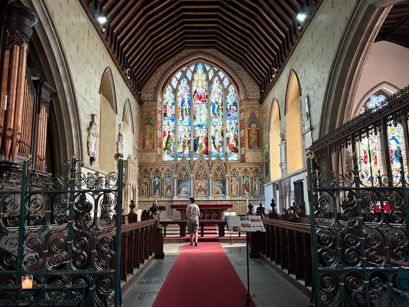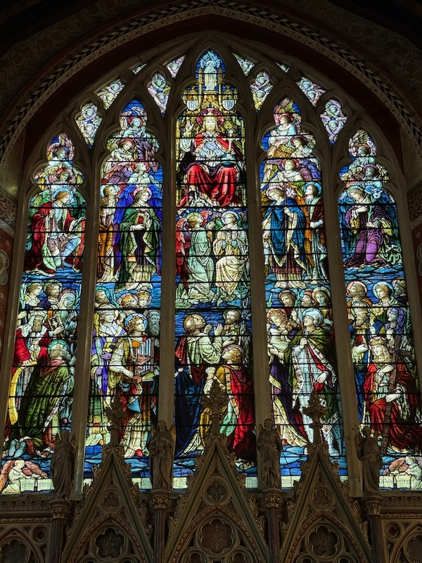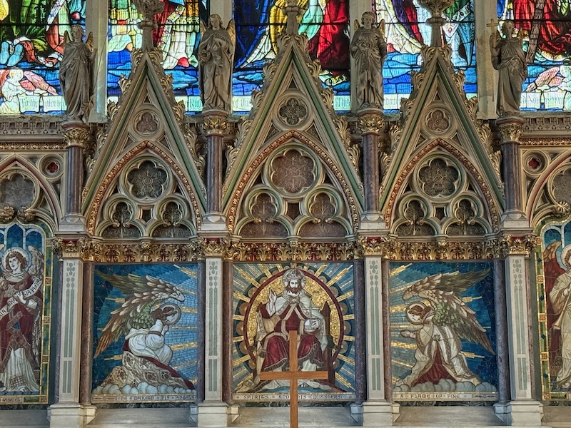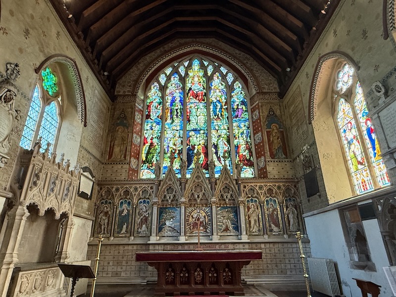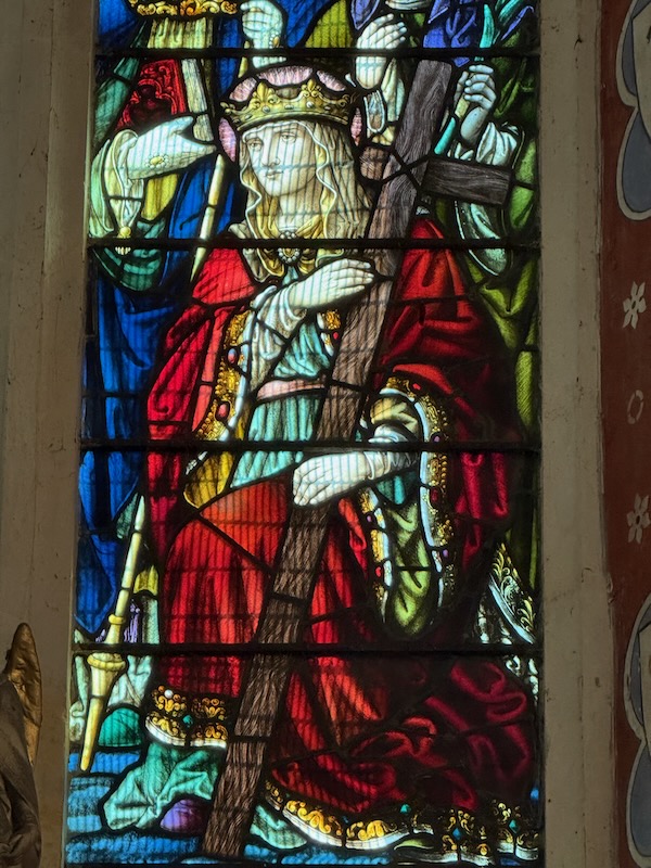 In the Sanctuary, the ceiling is more typical of English churches, being a wooden "boat-shape" ceiling. There is also a really nice triptych as the altarpiece. The stained-glass window behind has a variety of saints, including Saint Helena holding a large wooden cross.