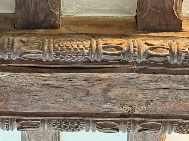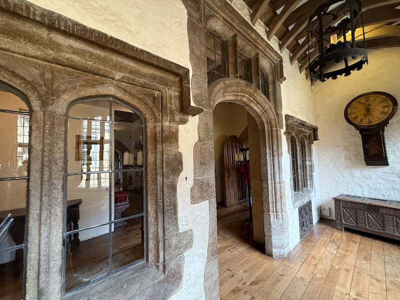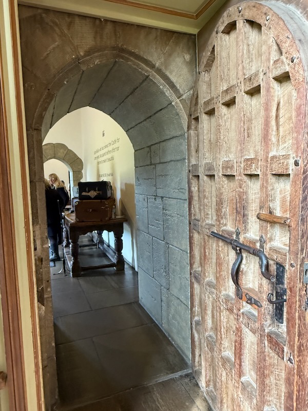 Here is an example of the "bits and pieces" of the medieval castle peeking out. There is a normal, rectangular doorframe and door, but it literally covers up a medieval arched entryway and arched door that the rectangular door is attached to.