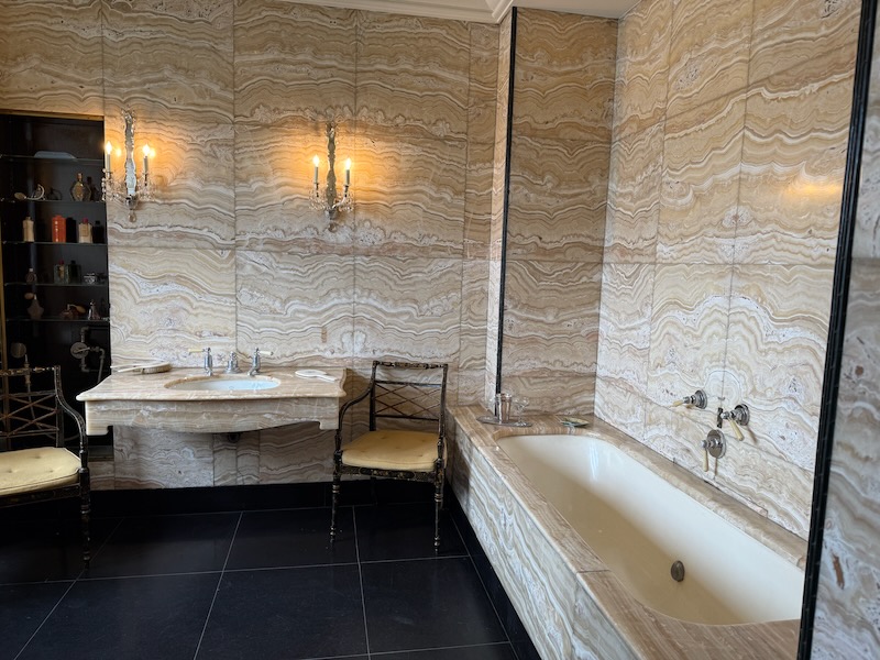 Lady Baillie's bedroom was done in 1936 in a French Regency style with 18th century wood paneling. Another "modern" convenience, you can see the 2 reading lights on the headboard. The bathroom is the most lavish in the castle, with walls lined with Russian Onyx. Much better than the green tile that we saw in another castle.