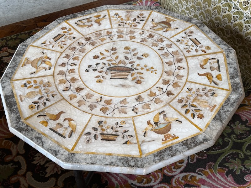 The dining room design dates from 1938 and is a fusion of English, French, and Chinese styles. On the far wall is a Louis XIV clock from the early 18th century.