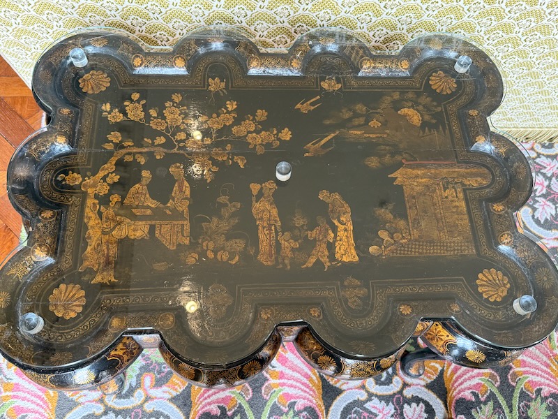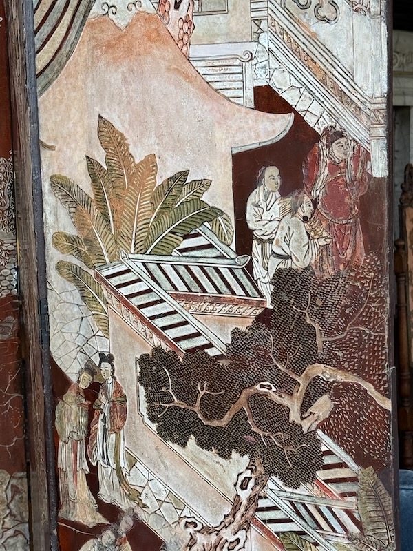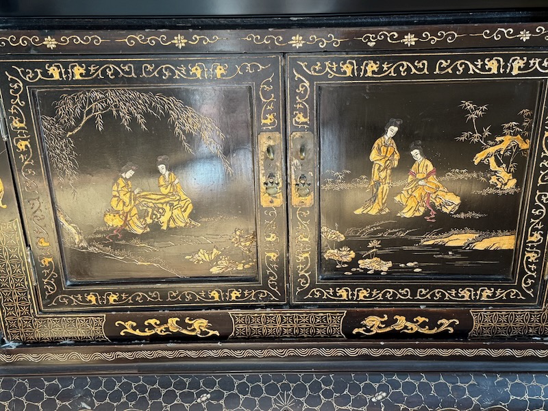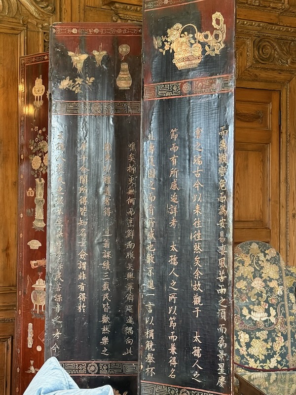 The Thorpe Drawing Room gets its name from the Thorpe Hall in Peterborough, where the pine panelling and chimney piece, dating from 1653, came from. When it arrived, it was painted green and in thousands of pieces. The paint was removed and refinished and then reassembled like a huge jigsaw puzzle. Quite a few Chinese decorative items, like the 2 lacquered screens and a black cabinet with inlays.