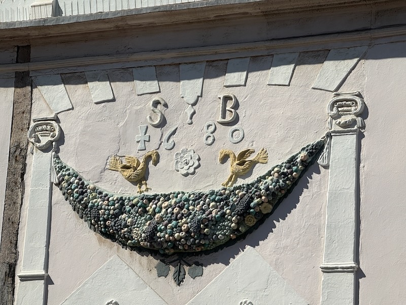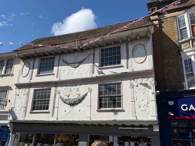 This house is on Week Street, which lies along the line of a Roman road linking Rochester with the ironworking areas and the port. Foundations of a Roman building were found here in the 1960s. This house, built in 1680, is an example of "pargetting", where external lime plaster is used in a decorative manner. This became common when the "wattle and daub" (the stuff that was put between the wood beams) of the half-timbered Tudor houses began to fall into decay.