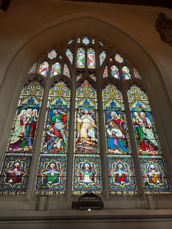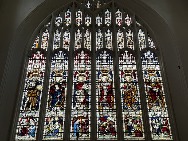 The All Saints Window was made in 1890 and has 28 Saints, 4 coats of arms, and 6 bible scenes.