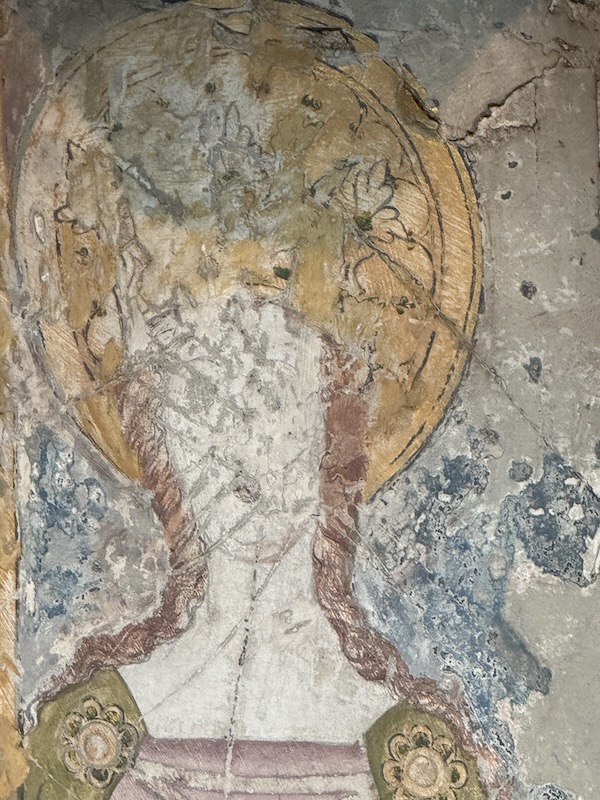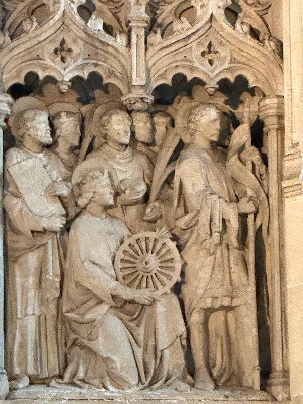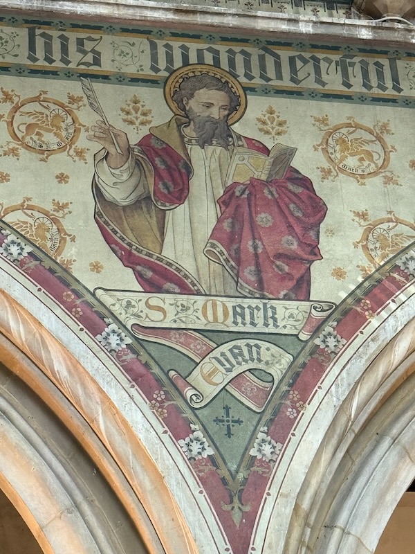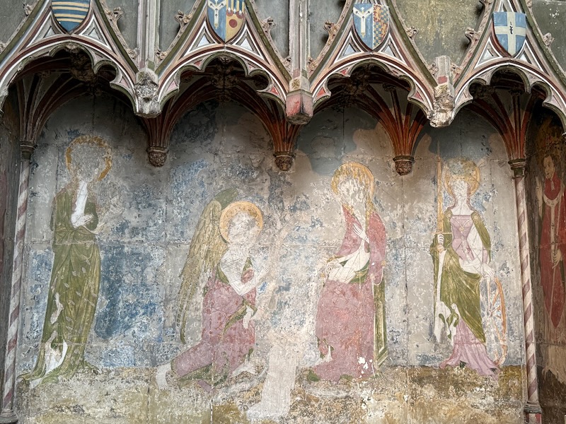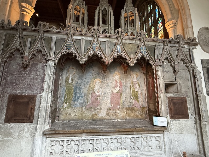 This is in a side chapel of the Chancel, with a large tomb dating to 1417. It is richly painted with a scene from The Annunciation, showing Mary and the Archangel Gabriel. In the closeup picture, you can see mutilation of the painted face and sword slashes across it. These were done by anti-religious soldiers in the Battle of Maidstone in 1648.