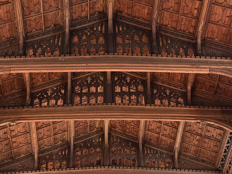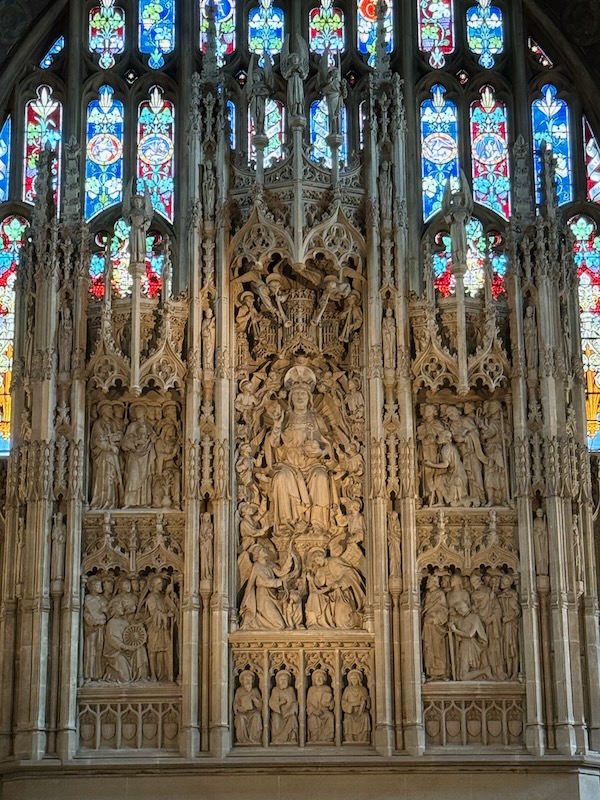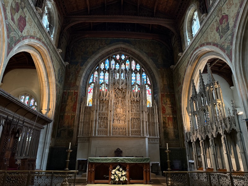 The Sanctuary has the same high wooden roof as the Nave and the walls above the arches are colorfully painted. The large stone monument behind the altar in the Sanctuary is known as a Reredos. It was added in 1904 and dedicated by the Archbishop of Canterbury.