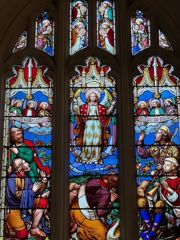 The stained-glass in this window was done in 1862 and the panels illustrate the death of Christ.