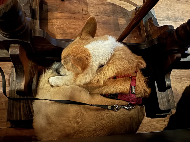 You can tell that Lucy was tired ... this is NOT her normal position at a restaurant. Usually, she is out, begging for food ... today ... curled up in a ball under the table.