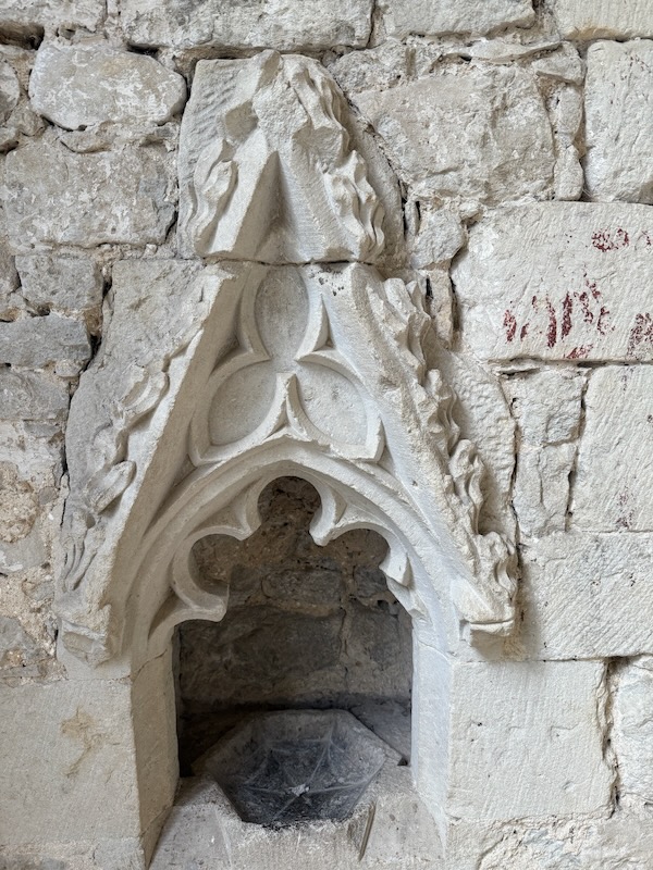 The nearest church was 4 miles, which in that time was a long way. By having their own chapel, they could avoid a long and troublesome journey. There would have been an external staircase that would allow the chaplain to enter without going through the house. Two decorative features remain: a corbel with fine carving that had a statue or candlestick, and a 14th-century piscina, a niche that would have been filled with water.