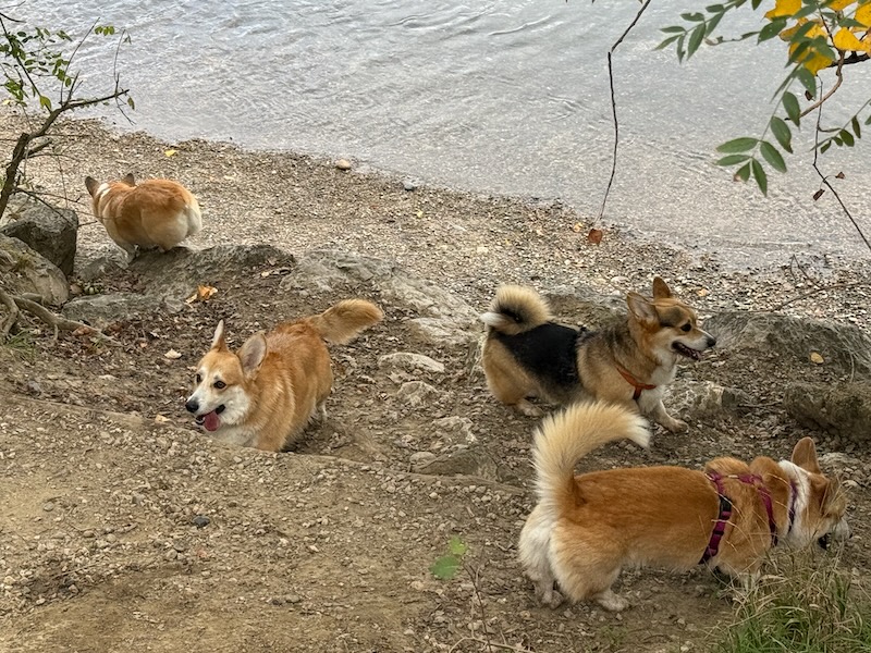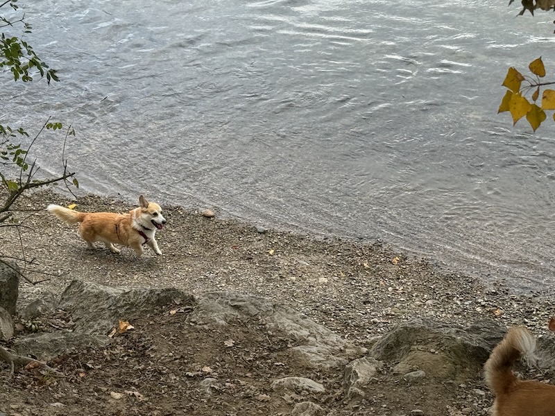 The park that we went to runs alongside a river, and the dogs enjoy running down the bank to the water. Sometimes they walk in the water, sometimes a little swimming, and other times, they just like to run up-and-down the banks.